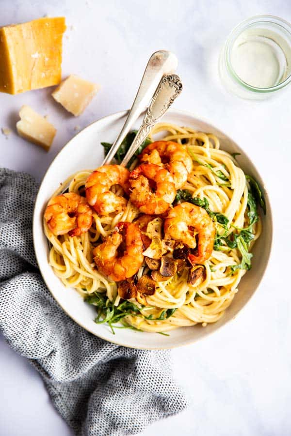 Cacio e Pepe with Lemon Garlic Butter Shrimp