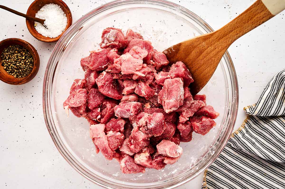 - Note 1: Tossing the meat in cornstarch as the first step allows the pork to sit with the cornstarch for a few extra minutes, which can help keep the meat tender. So be sure to do this first.