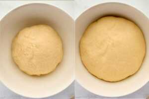 Knead dough:In the bowl of a stand mixer, combine flour and salt. Add yeast mixture, knead with the dough hook attachment on medium speed for 8-10 minutes, or until dough is soft and stretchy.If needed, add more flour, 1 tablespoon at a time, until dough pulls away from the sides of the bowl and forms a soft ball.Tip: The dough should feel soft and slightly tacky but not stick in large clumps to your fingers.